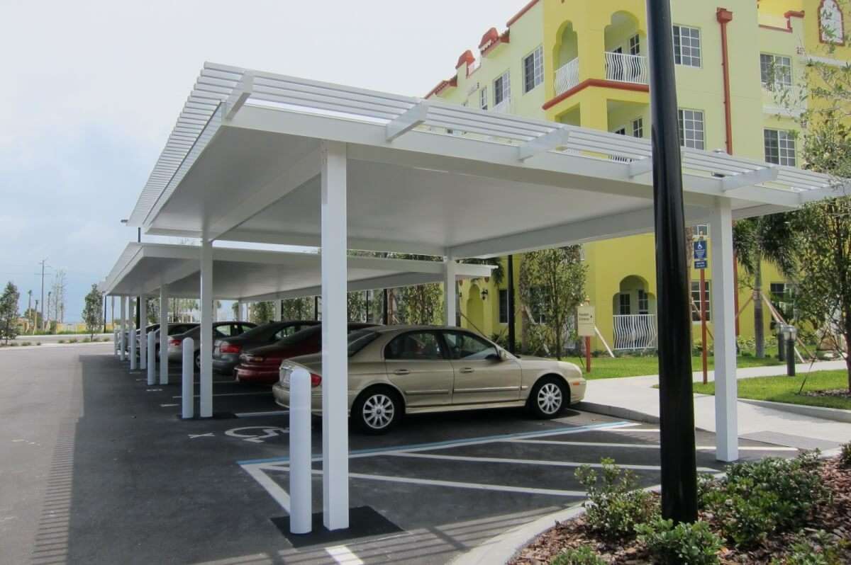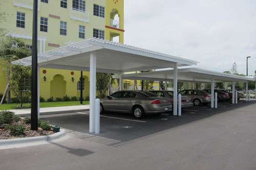 Enhance your commercial property and protect your customers and staff vehicles from weather and damage with a beautifully built, weather resistant custom carport. Covered parking structures and commercial carports help protect auto paint, upholstery, dashboards, roofs, and interior colors from the brutal Central Florida sun, heavy rainstorms and even occasional hail. Your clients and customers will appreciate the protection and safety these structures provide: